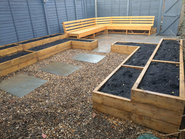 A stepping stone path leads from the kitchen doors to a sandstone patio at the back of the garden. Large, L-shaped, tiered beds to each side provide space for a tidy kitchen garden. A bespoke large corner bench gives ample room for social gatherings.